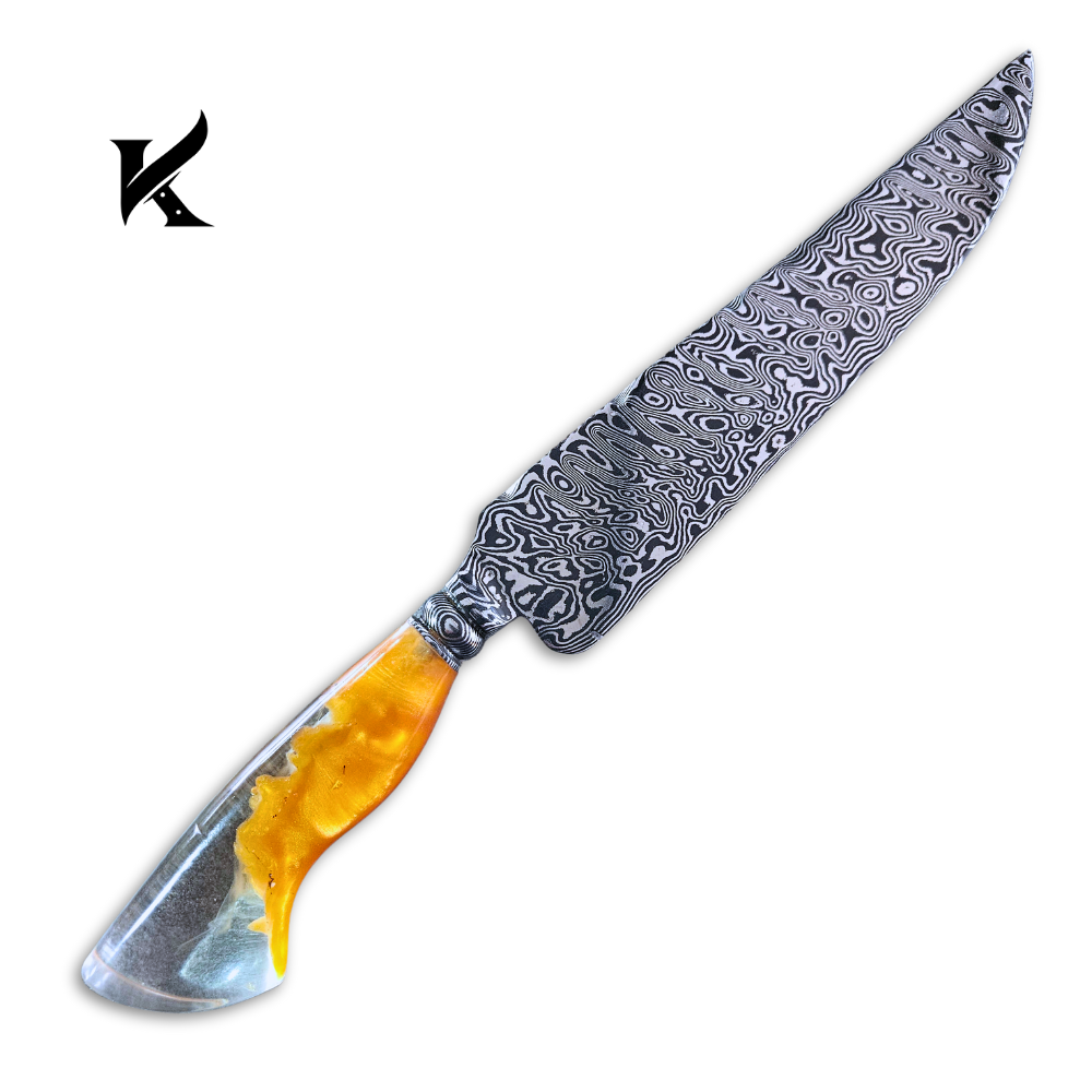 Faca Aço Damasco Picanheira do chefe 280 camadas. Cabo estabilizado fotoluminescente. Garantia Vitalícia
