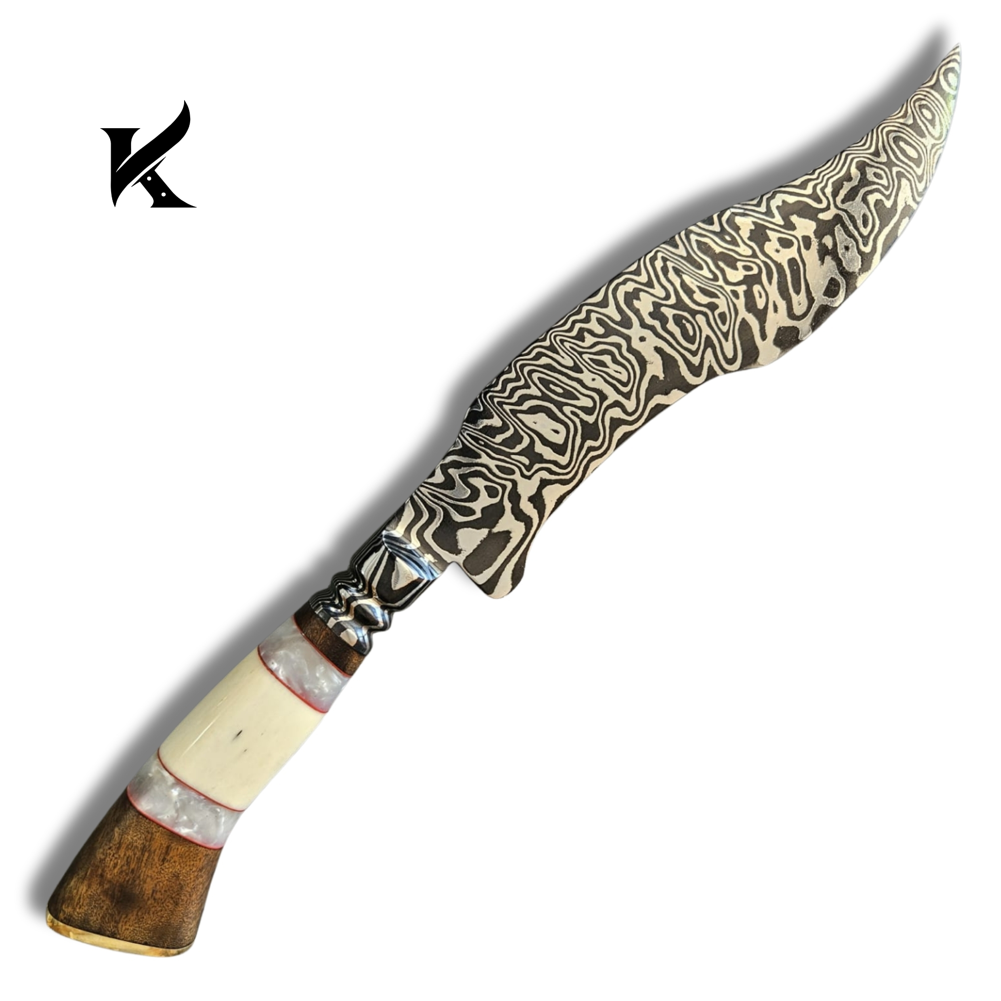 Faca Aço Damasco Picanheira 320 camadas. Cabo Burl de imbuia, osso e resina. Garantia Vitalícia