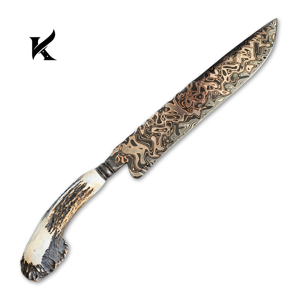 Faca Aço Damasco Tiger, Cabo Coroa chifre de cervo. Cutelaria artesanal, Garantia Vitalícia. O melhor presente para quem você ama!