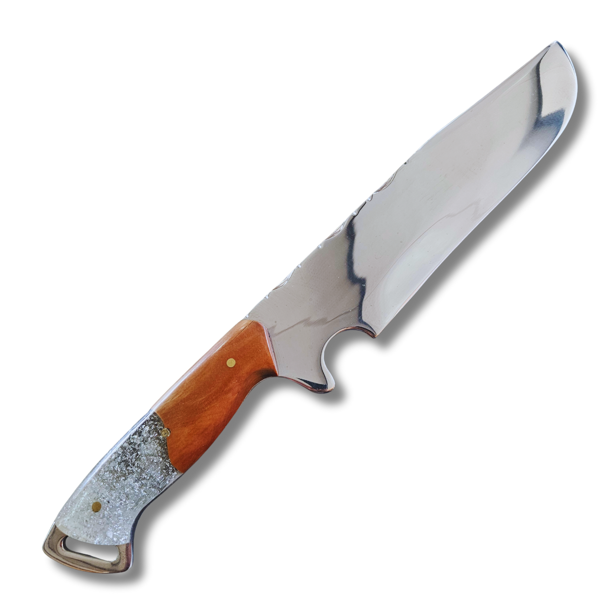 Faca Artesanal Passa fiel 9" com Bainha em couro e personalização grátis. Cabo Fulltang Madeira nobre e resina. Garantia Vitalícia