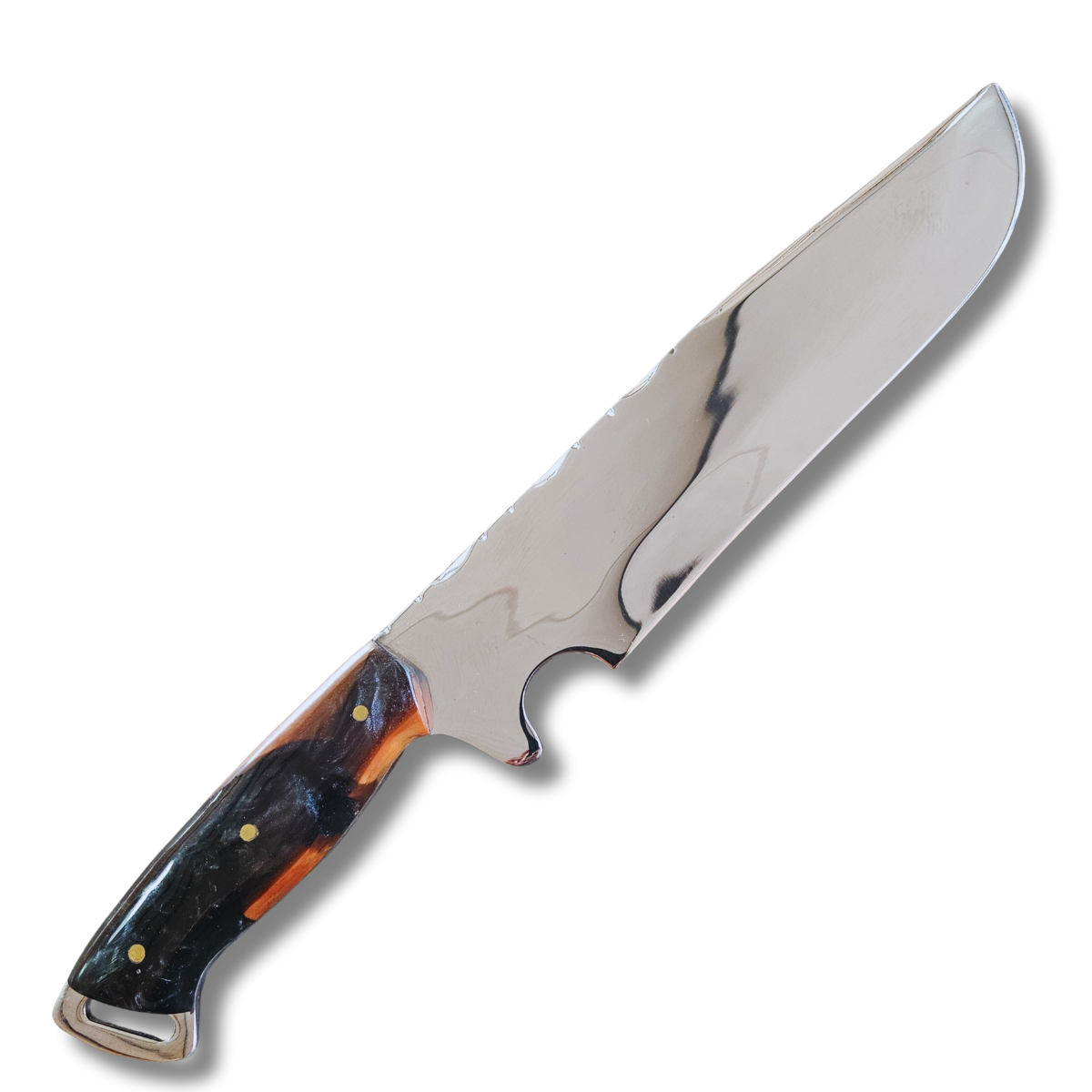 Faca Artesanal Passa fiel 9" com Bainha em couro e personalização grátis. Cabo Fulltang Madeira nobre e resina. Garantia Vitalícia