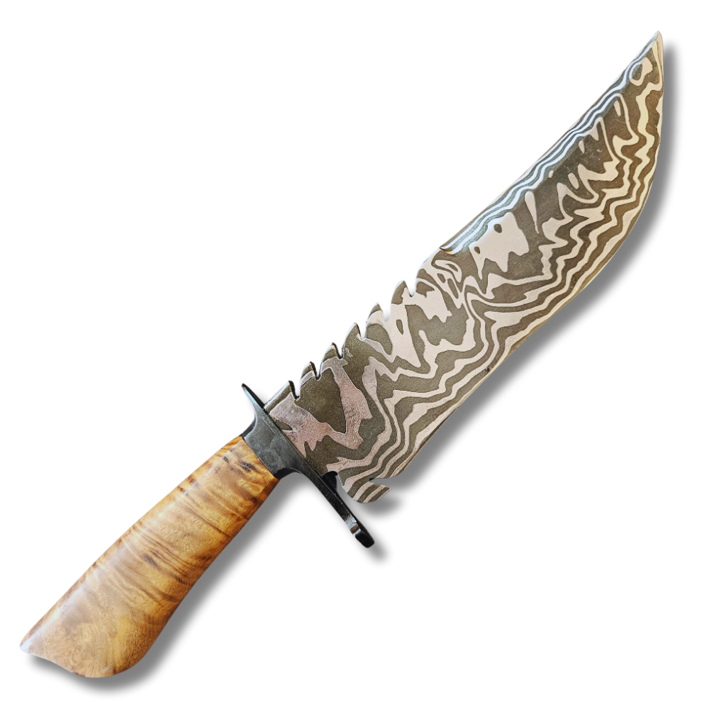 Forjada em aço damasco, reconhecido por sua beleza singular e excelente retenção de fio, esta lâmina oferece sofisticação, resistência e durabilidade. O desenho natural das camadas do damasco reforça sua estética única — uma verdadeira obra de arte em forma de faca.