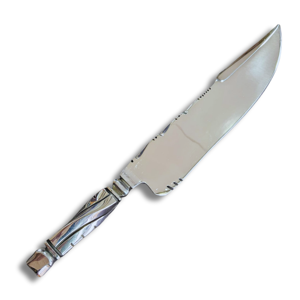 Forjada em aço inox 420, material nobre e resistente ao desgaste, esta faca mantém o fio afiado por muito mais tempo. O acabamento mosqueado e rústico reforça sua estética única — uma faca de presença, feita para impressionar e durar.